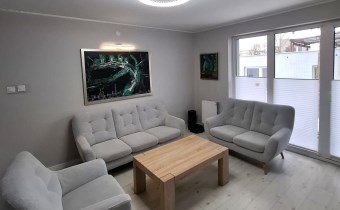 Duży taras na poziomie 1 piętra, na parterze balkon przy salonie.