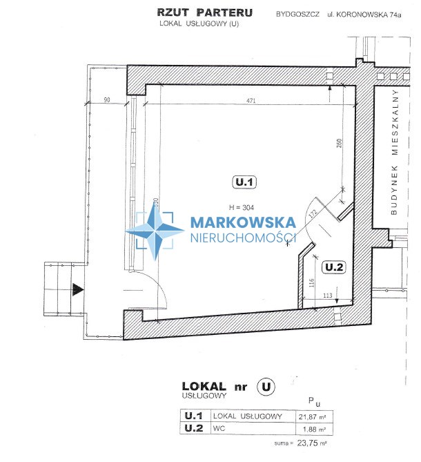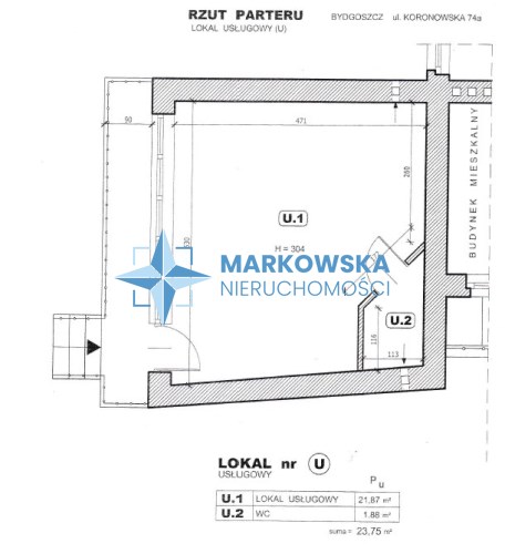 Front nieruchomości bezpośrednio przy ul. Koronowskiej – jednej z głównych arterii północnej części Bydgoszczy. Lokal widoczny z ulicy, łatwy do oznakowania i wyeksponowania reklamy.